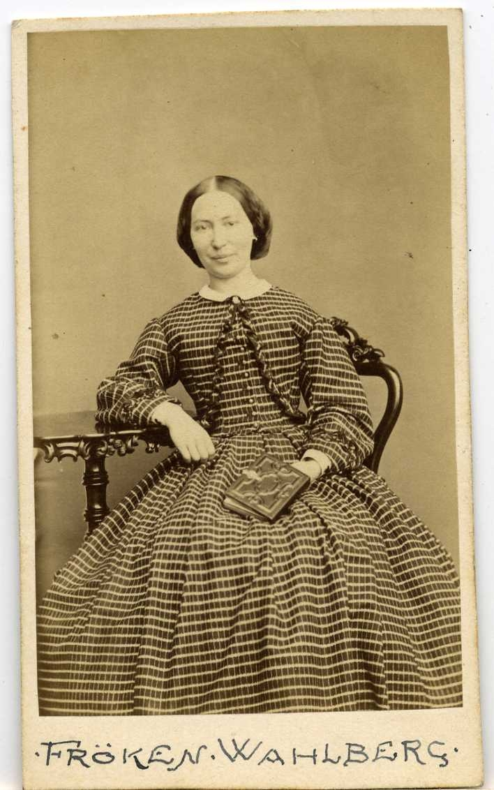 Porträtt av en kvinna i rutig klänning som sitter vid ett rund pelarbord, hon håller en bok i vänster hand.