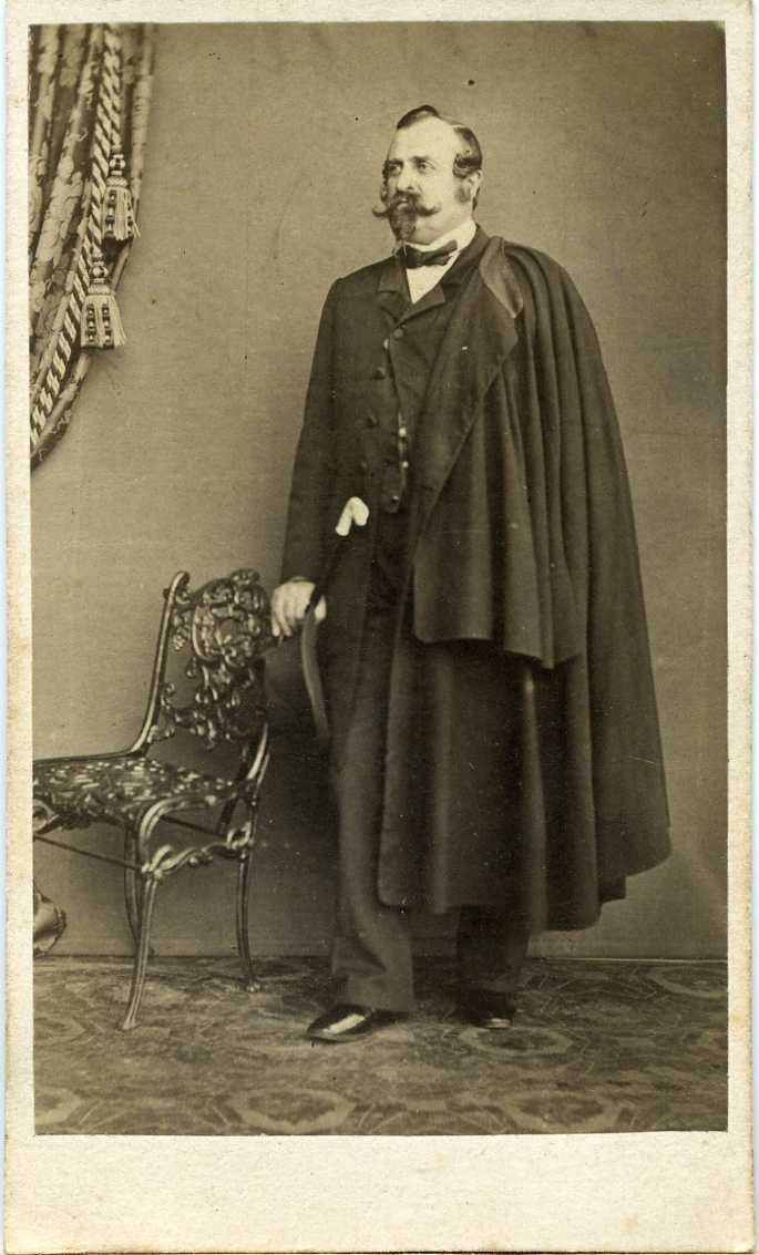 Porträtt av en man mustasch och pipskägg. En mörk slängkappa över axeln samt käpp och hatt i höger hand.
