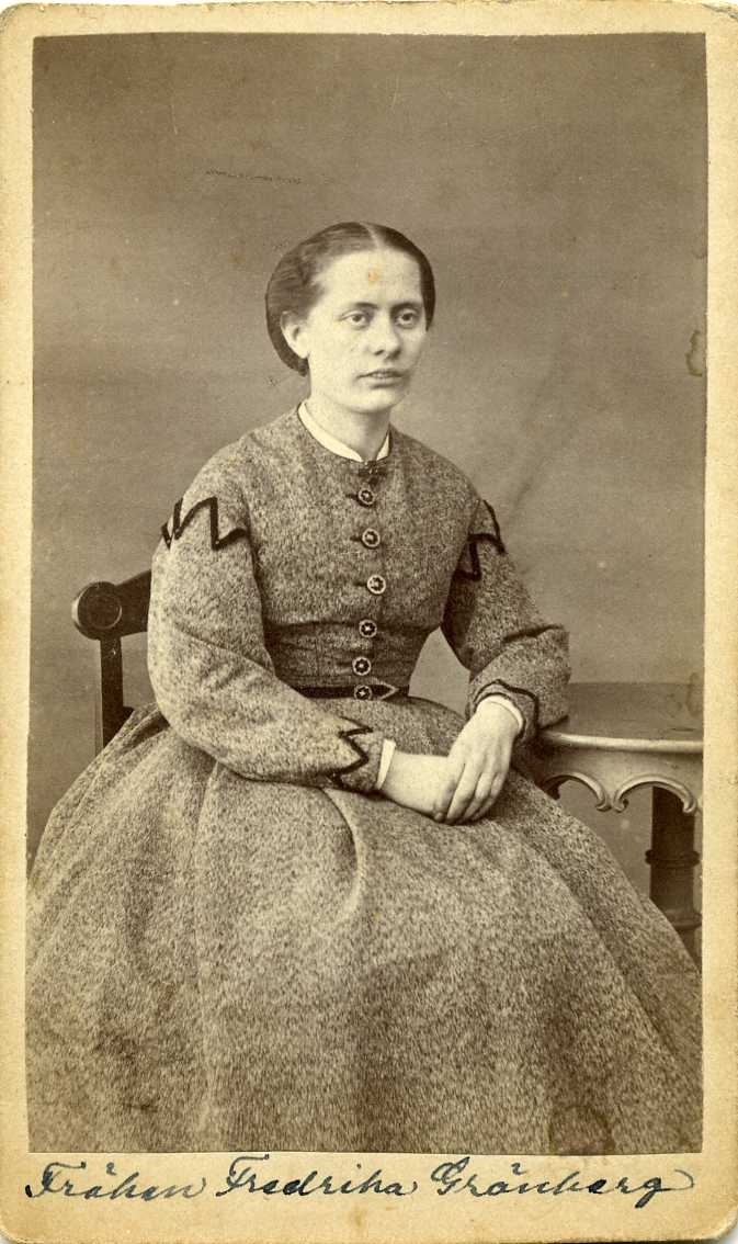 Porträtt av en kvinna som sitter vid ett pelarbord.