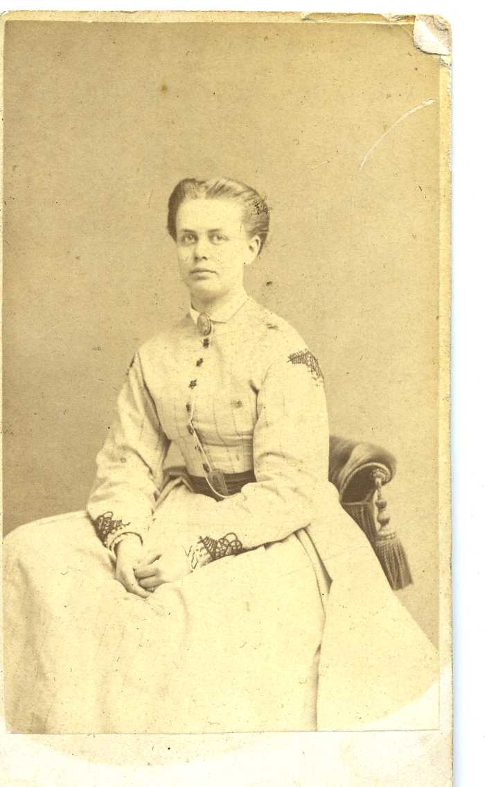 Porträtt av en ung kvinna i ljus klänning med broderier vid ärmarna. Hon sitter på en emma.