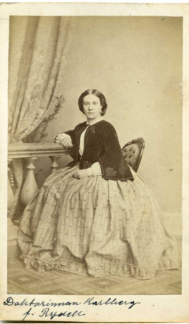 Porträtt av en kvinna i vid, ljus och mönstrad klänning. Hon vilar höger arm på ett räcke.