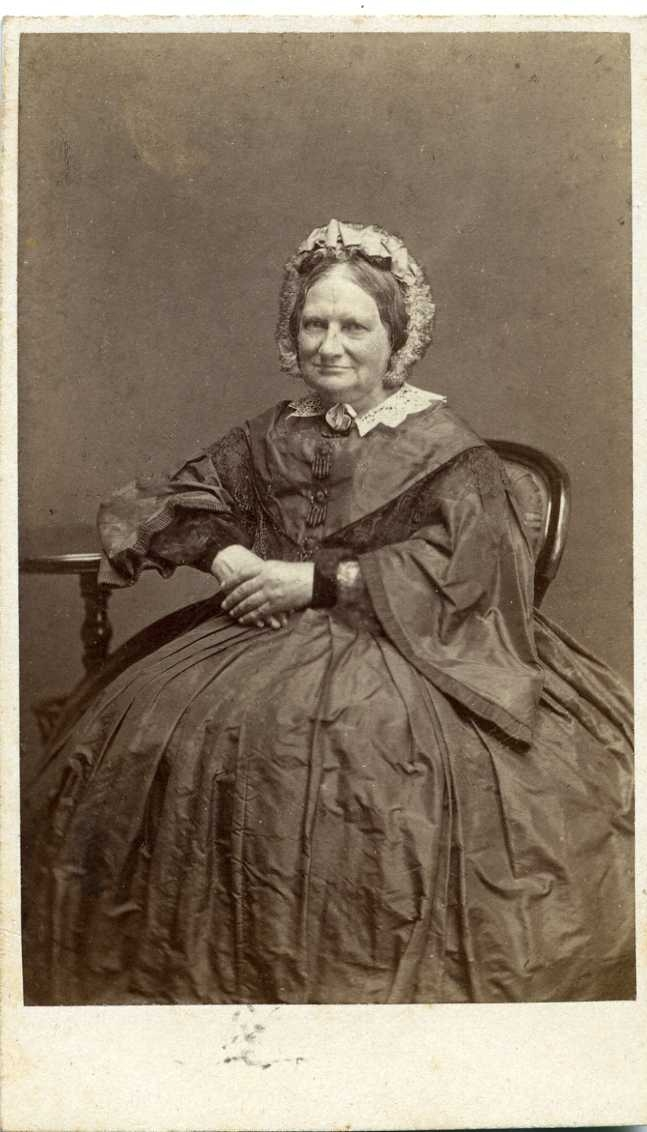 Porträtt av en kvinna i vid klänning och tunn mössa med veckad kant på huvudet. Hon sitter på en stol vi ett runt pelarbord.