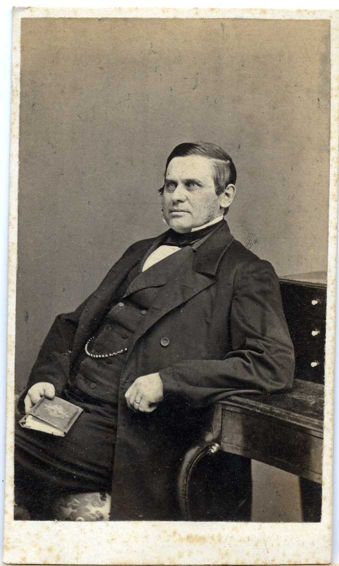 Porträtt av en sittande man som lutar sig mot ett skrivbord. Han håller en bok i höger hand.