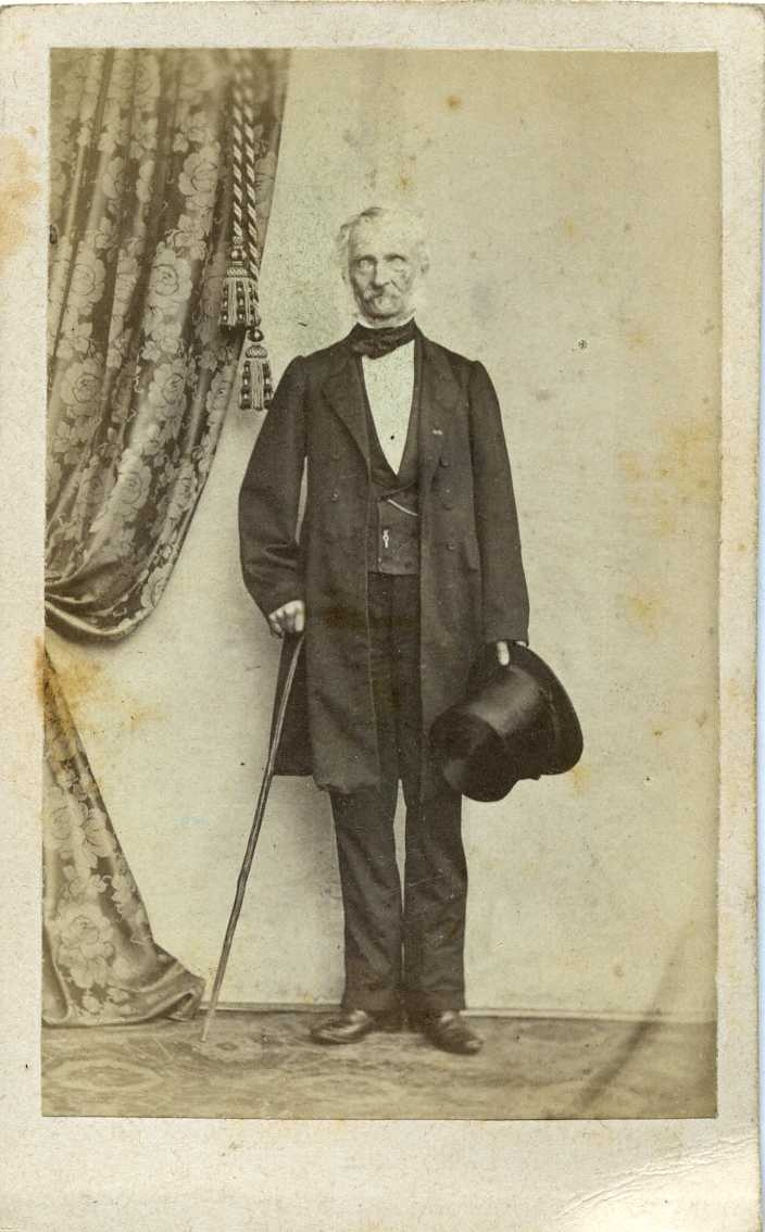 Porträtt av en man i rock med spatserkäpp i höger hand och en hög hatt i vänster hand.