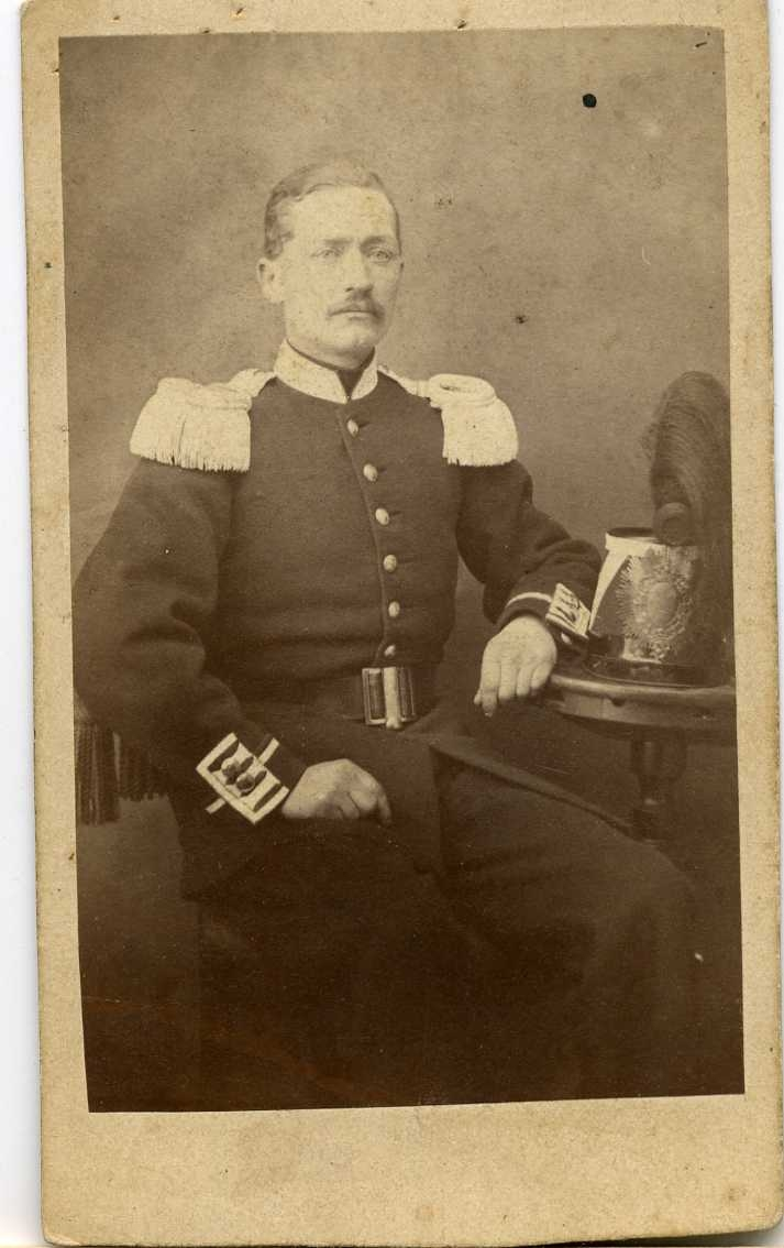Porträtt av en man i militär uniform, hans kask ligger på ett bord intill.