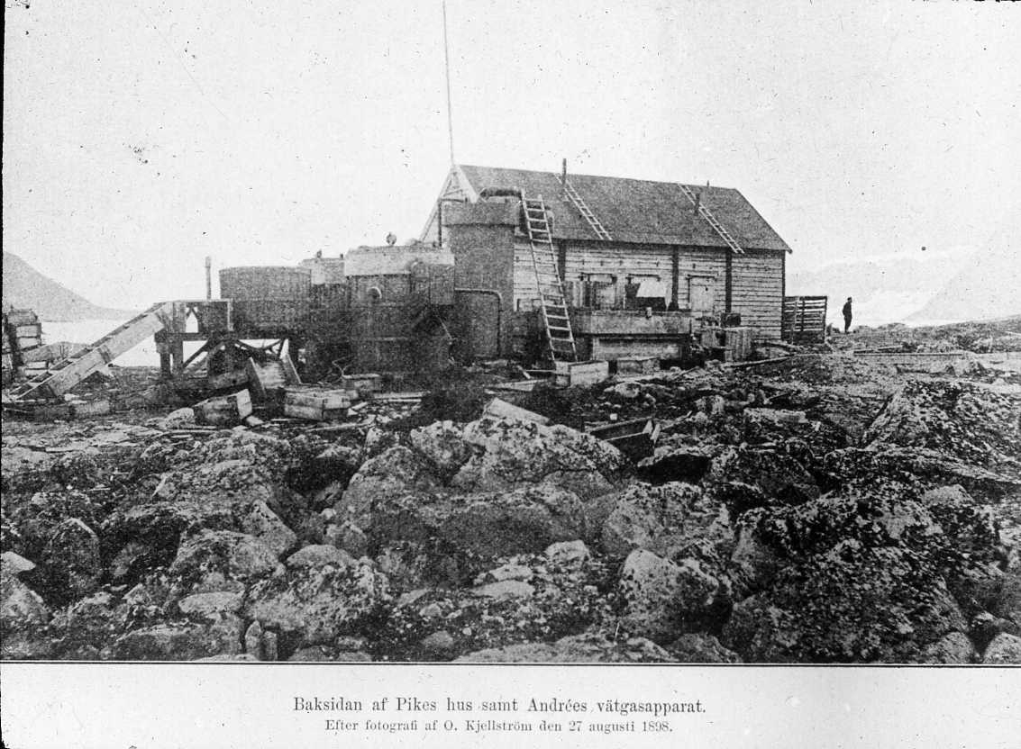 Diapositiv av en byggnad och vätgasapparat på Danskön, Spetsbergen.