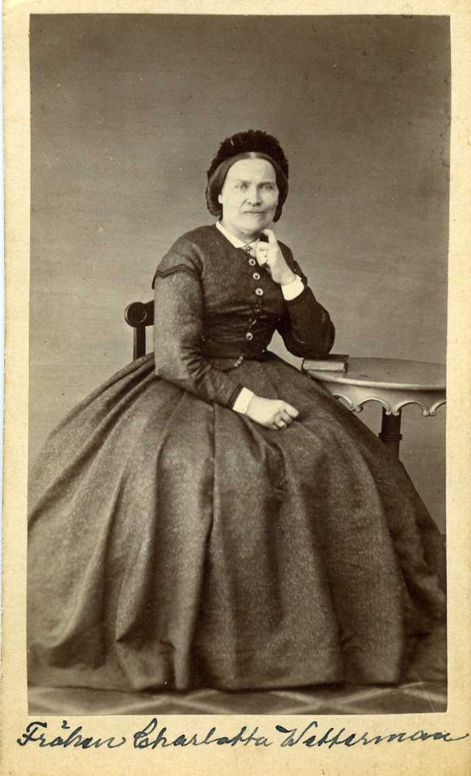 Porträtt av en kvinna i mörk vid klänning som sitter vid ett runt pelarbord. Hon håller vänster hand mot huvudet, armbågen vilar på en bok som ligger på bordet.