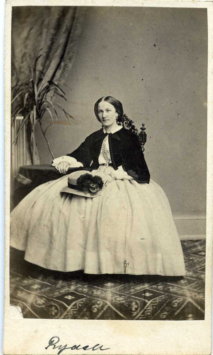 Porträtt av en kvinna i vid, ljus och klänning. Hon sitter vid ett bord som hon vilar höger arm på. I vänster hand håller hon en hatt.