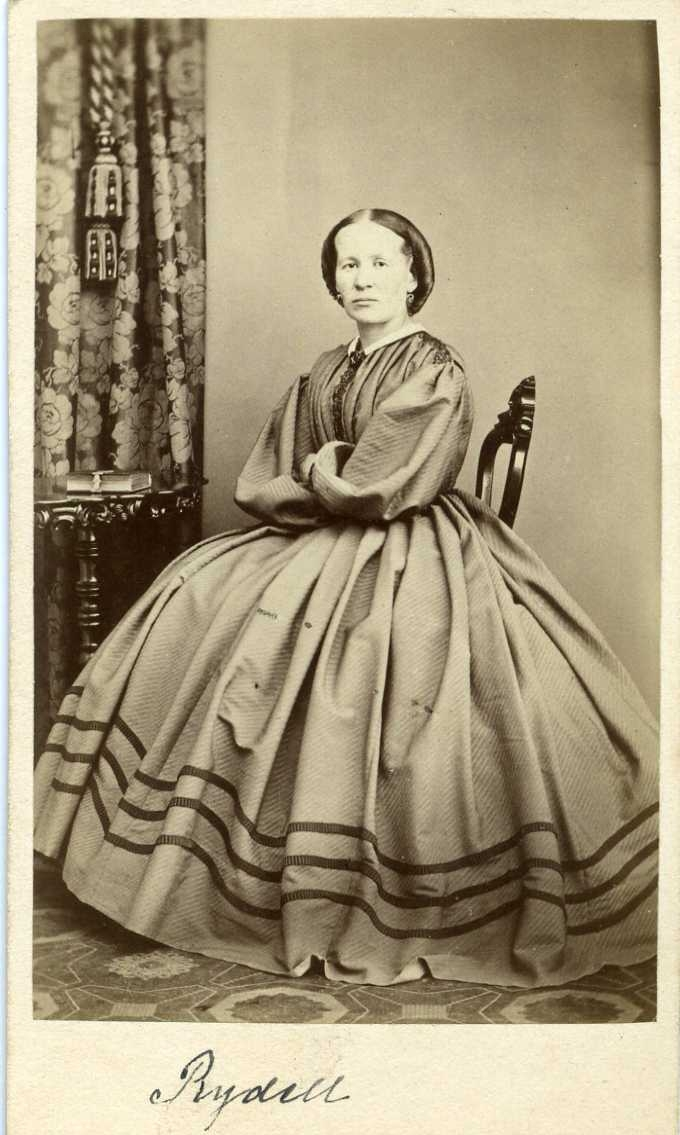 Porträtt av en kvinna i vid, ljus klänning. Hon sitter vid ett bord med armarna i kors. Tre smala mörka band längst ned på klänningen.