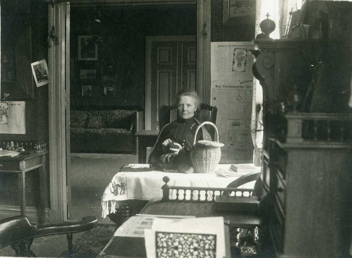 En kvinna i en hemmiljö. Hon sitter vid ett bord, vid ett fönster, med en vit duk. Hon har möjligen ett garnnystan i händerna.