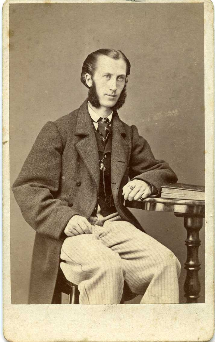 Porträtt av en man med stora polisonger, i rock och ljusrandiga byxor. Han sitter vid ett pelarbord där det ligger en bok. Han har flera ringar på vänster hand.