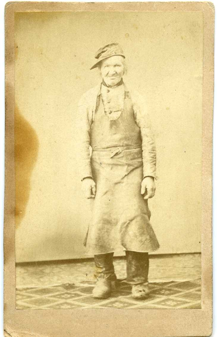 Porträtt av en man med förskinn, grova stövalar och keps på snedden på huvudet.