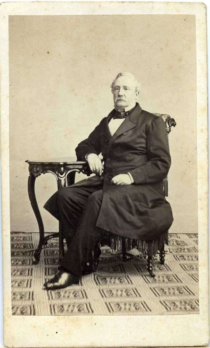 Porträtt av en man med rock som sitter vid ett litet bord.
