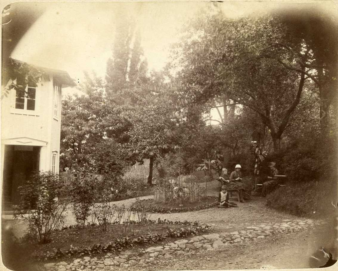 En trädgård i Gränna. Till höger sitter en kvinna med sina tre barn.