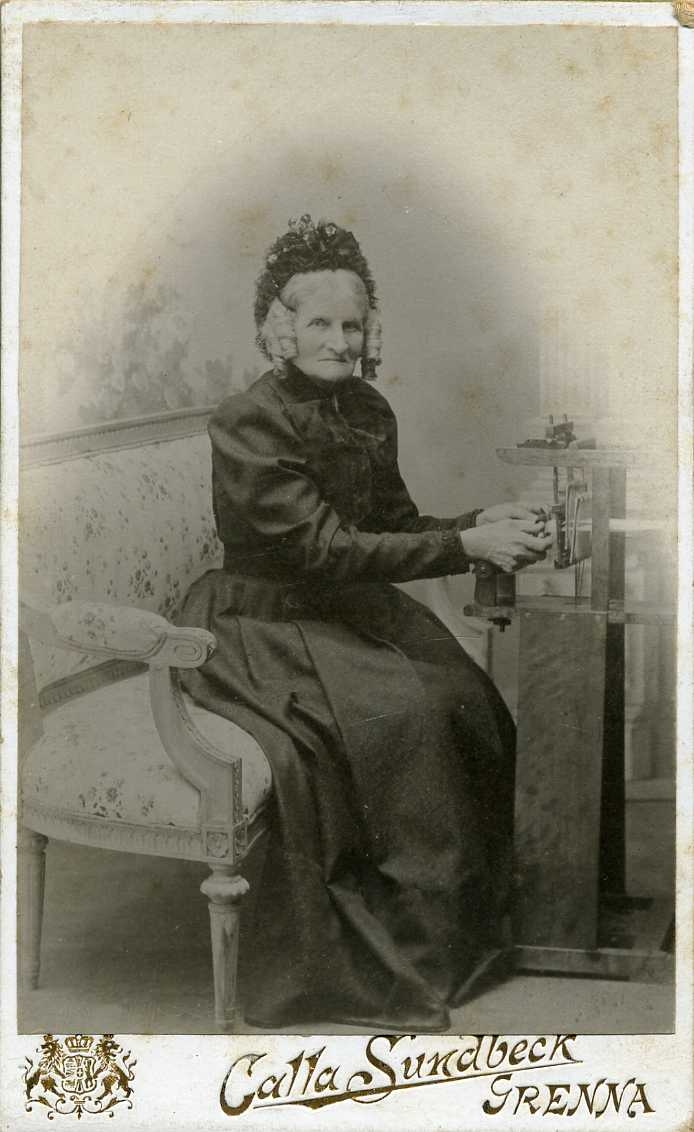 Porträtt av en kvinna som sitter vid en bandvävstol.