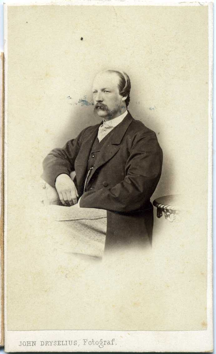 Porträtt av en man med stor mustasch som sitter på en stol.