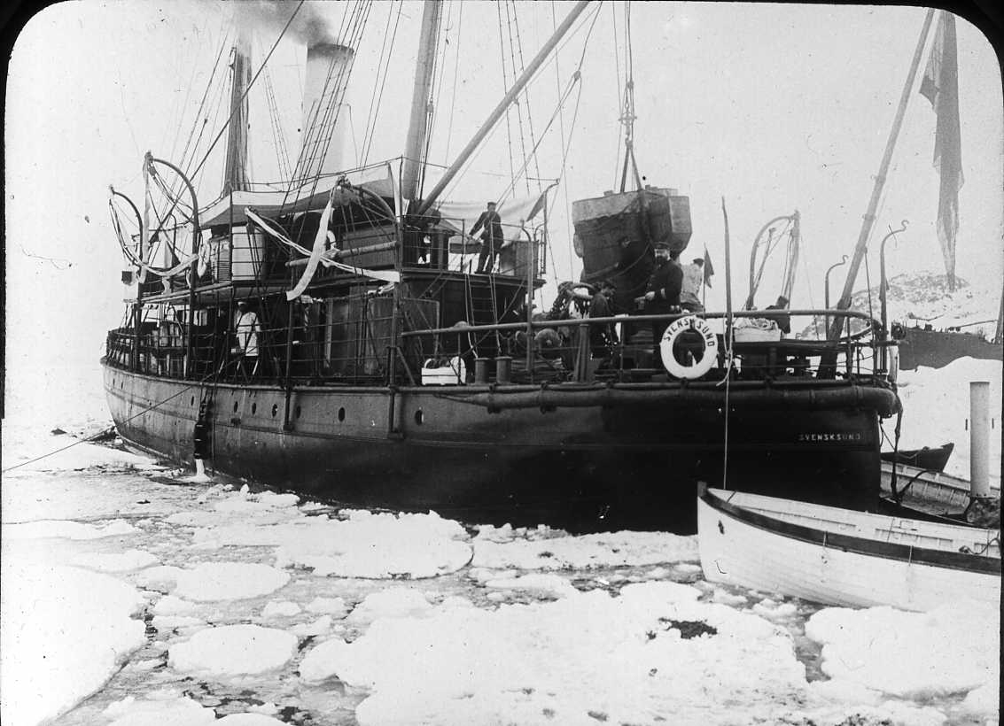 Diapositiv som visar lossning av en vätgasapparat från fartyget HMS Svensksund vid Danskön, mycket is runt fartyget.