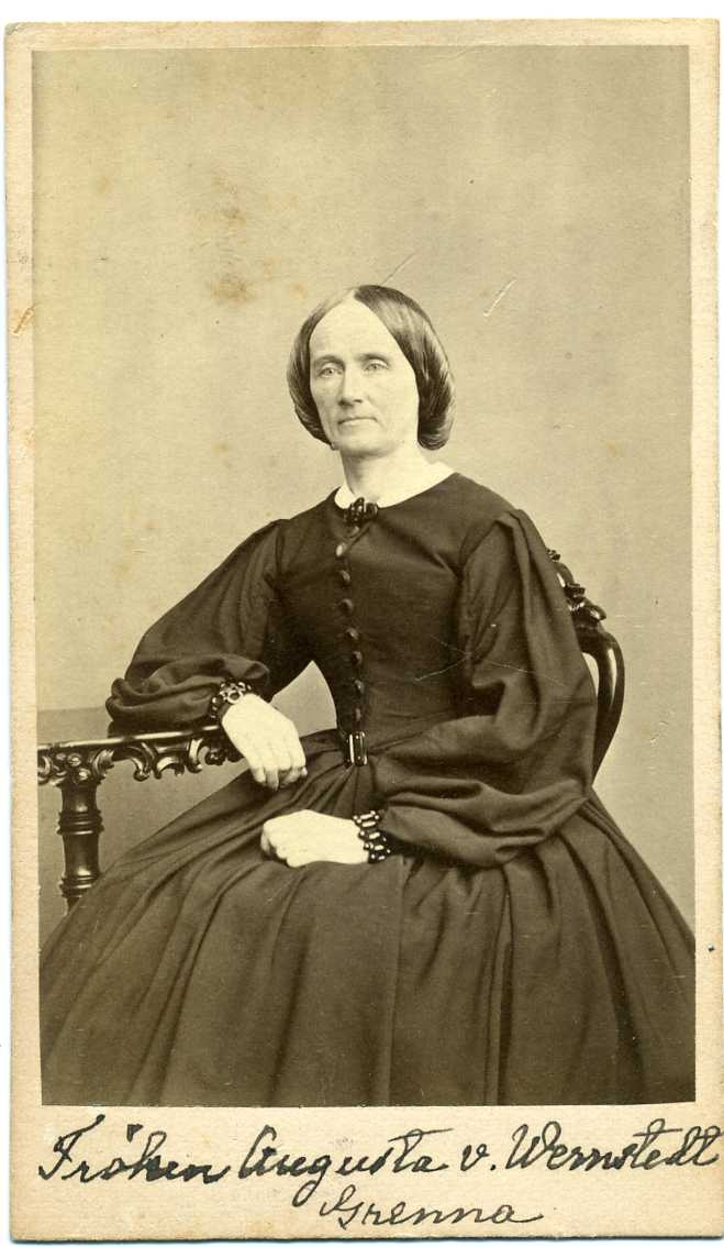 Porträtt av en kvinna i mörkt som sitter vid ett litet bord med ornamenterad sarg.