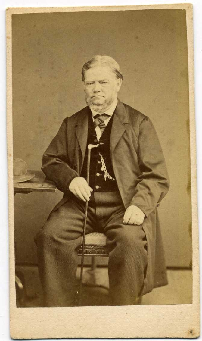 Porträtt av en man som sitter vid ett bord, med en käpp i höger hand. Hans hatt ligger på bordet.