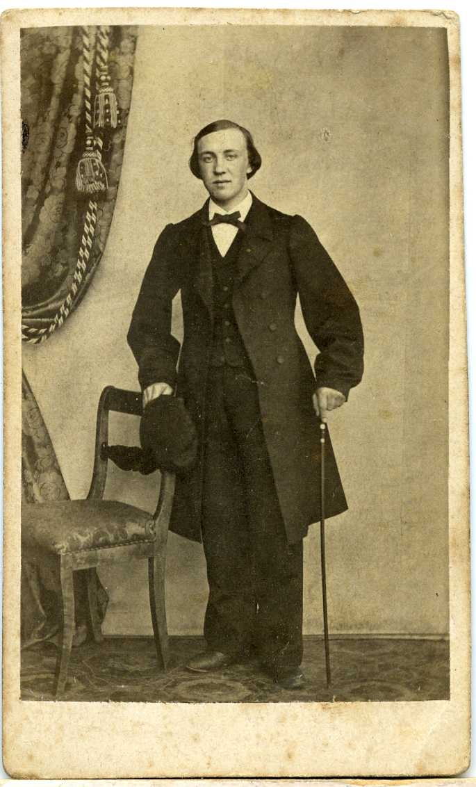 Porträtt av en man i rock stående vid en stol med keps i ena handen och en käpp i den andra.