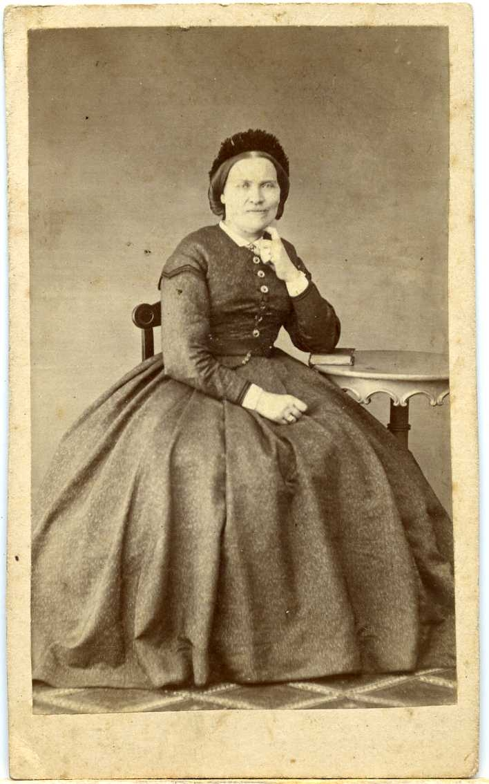 Porträtt av en äldre kvinna med en liten veckad huvudbonad. Hon sitter vid ett runt bord med vågig sarg, lutar huvudet mot vänster hand.