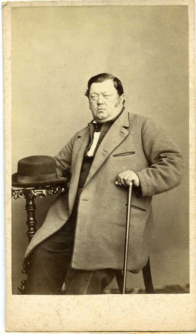 Porträtt av en med ljus rock och käpp i vänster hand. Han sitter på stol vid ett litet pelarbord med vågig sarg. En hatt ligger på bordet.