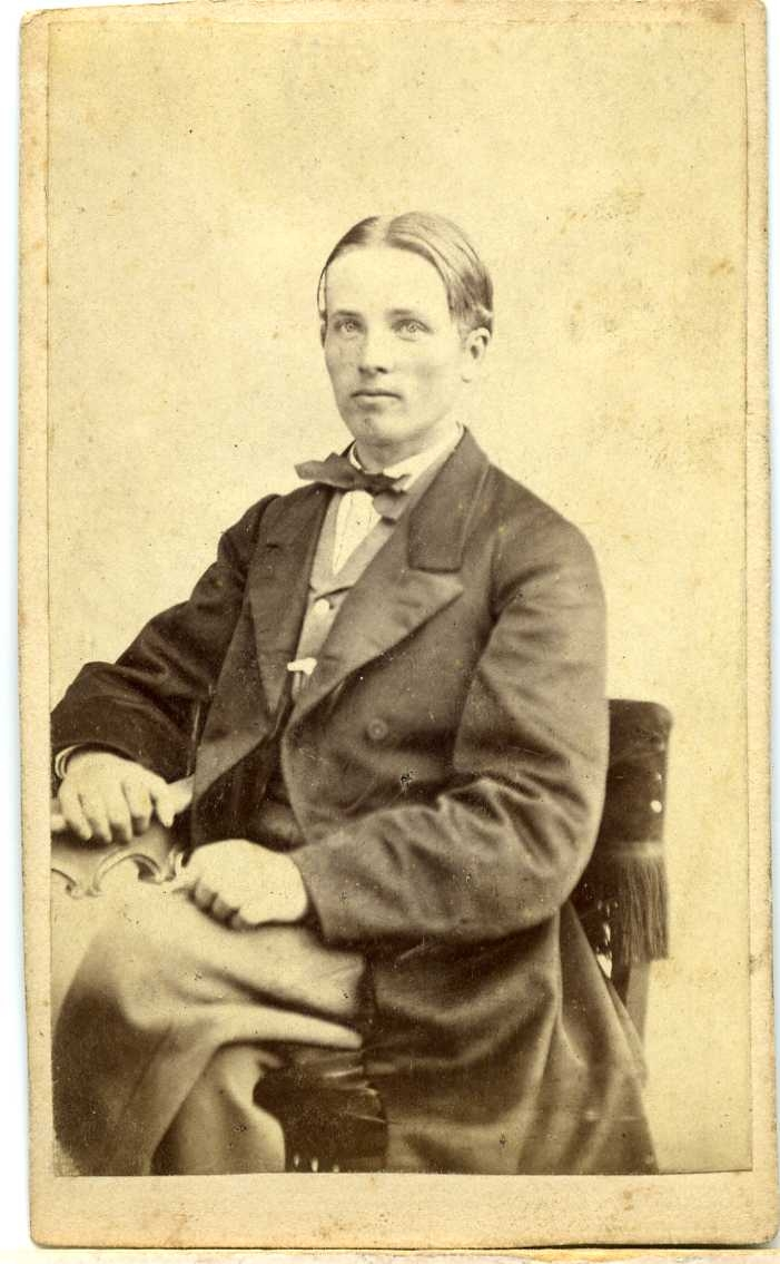 Porträtt av en ung man som sitter på en stol vid ett litet pelarbord med vågig sarg.