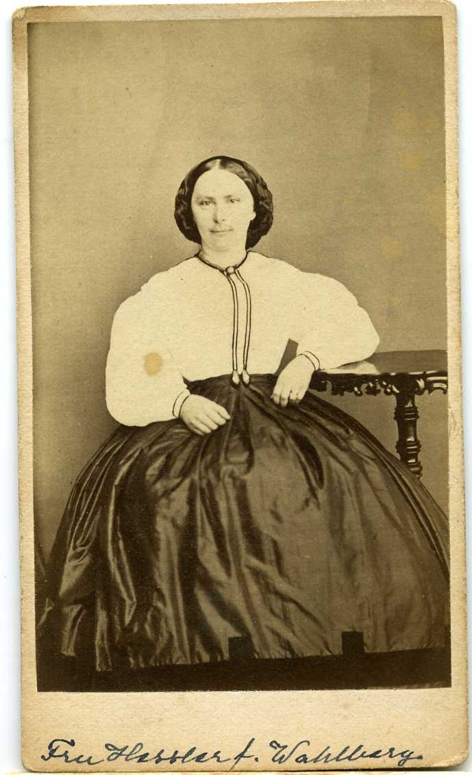 Porträtt av en kvinna i vid mörk klänning och ljust livstycke. Hon sitter vid ett rund pelarbord.