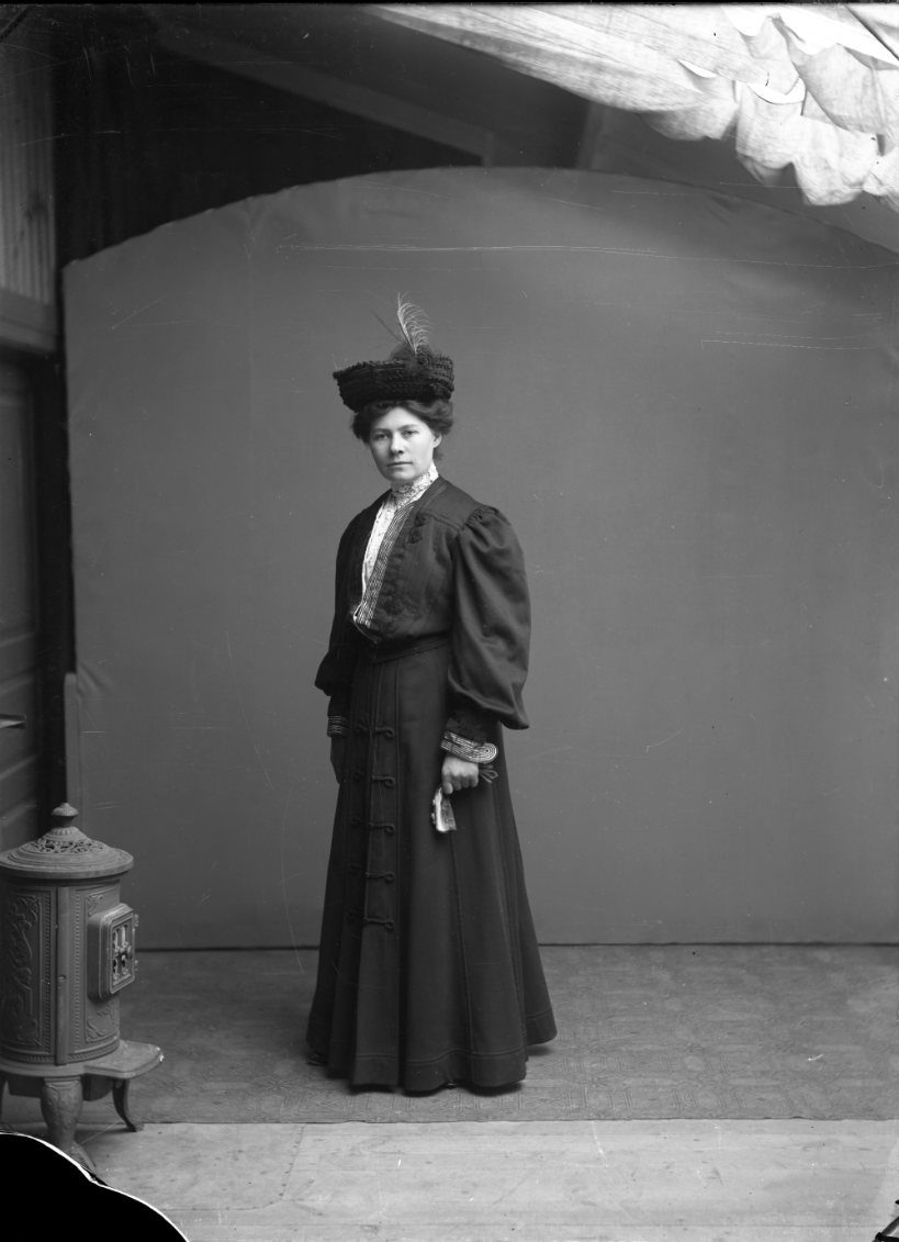 Porträtt av okänd kvinna med hatt och ytterkläder, hon håller handskar i vänster hand. Det står en liten kamin intill henne.