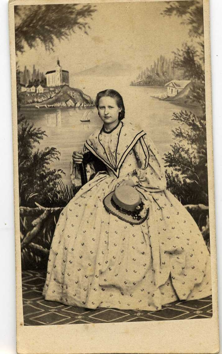 Porträtt av en flicka i ljus mönstrad klänning. Hon sitter på en stol med en hatt i vänster hand.