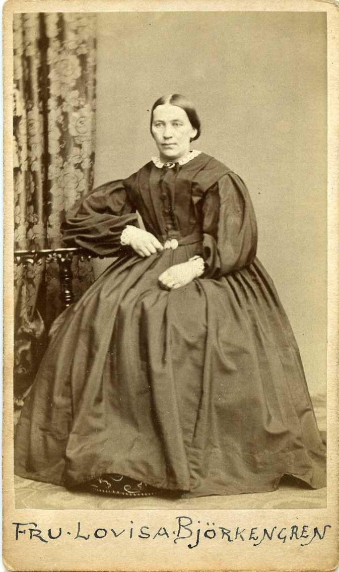 Porträtt av en kvinna i vid mörk klänning som sitter vid ett pelarbord.