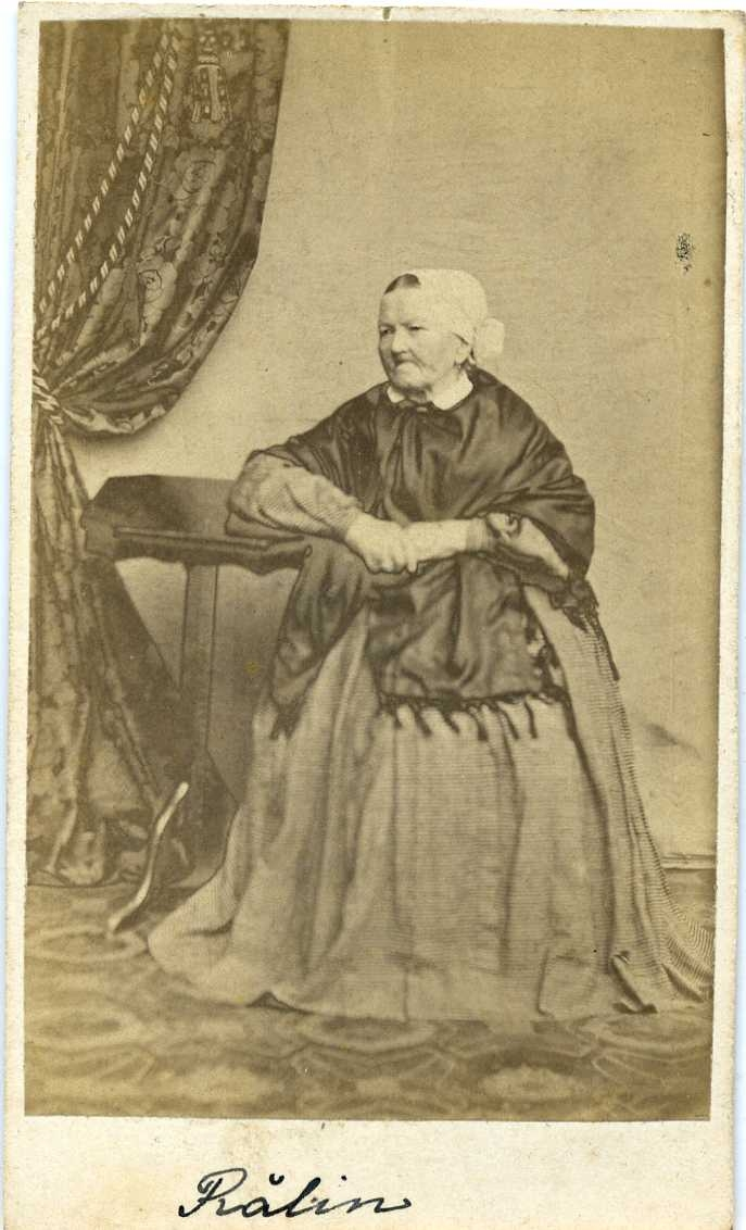 Porträtt av en äldre kvinna med huckle som sitter vid ett pelarbord.