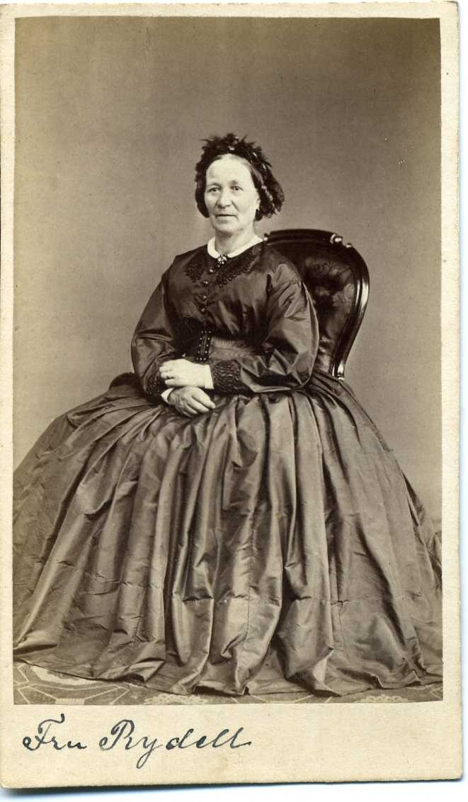 Porträtt av en kvinna i vid klänning som sitter på en emma.