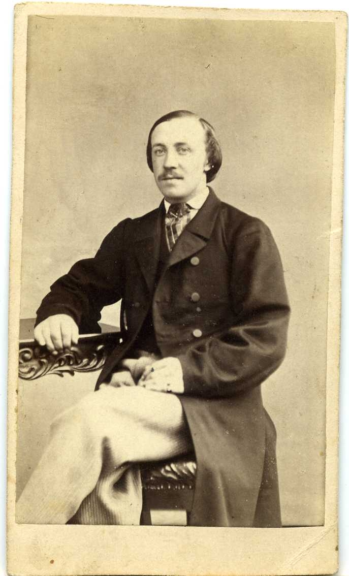 Porträtt av en man i ljusa smalrandiga byxor och mörk rock. Han sitter vid ett bord.