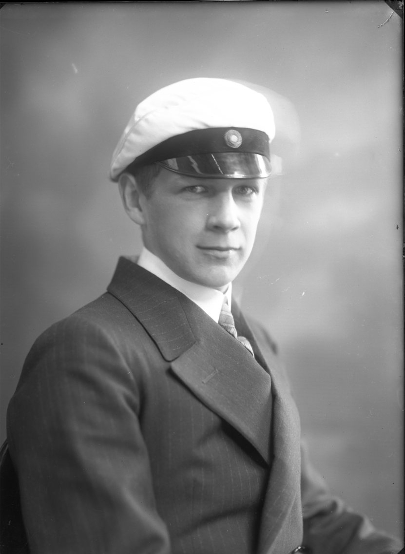 Porträtt av en yngling med studentmössa på huvudet, bröstbild.