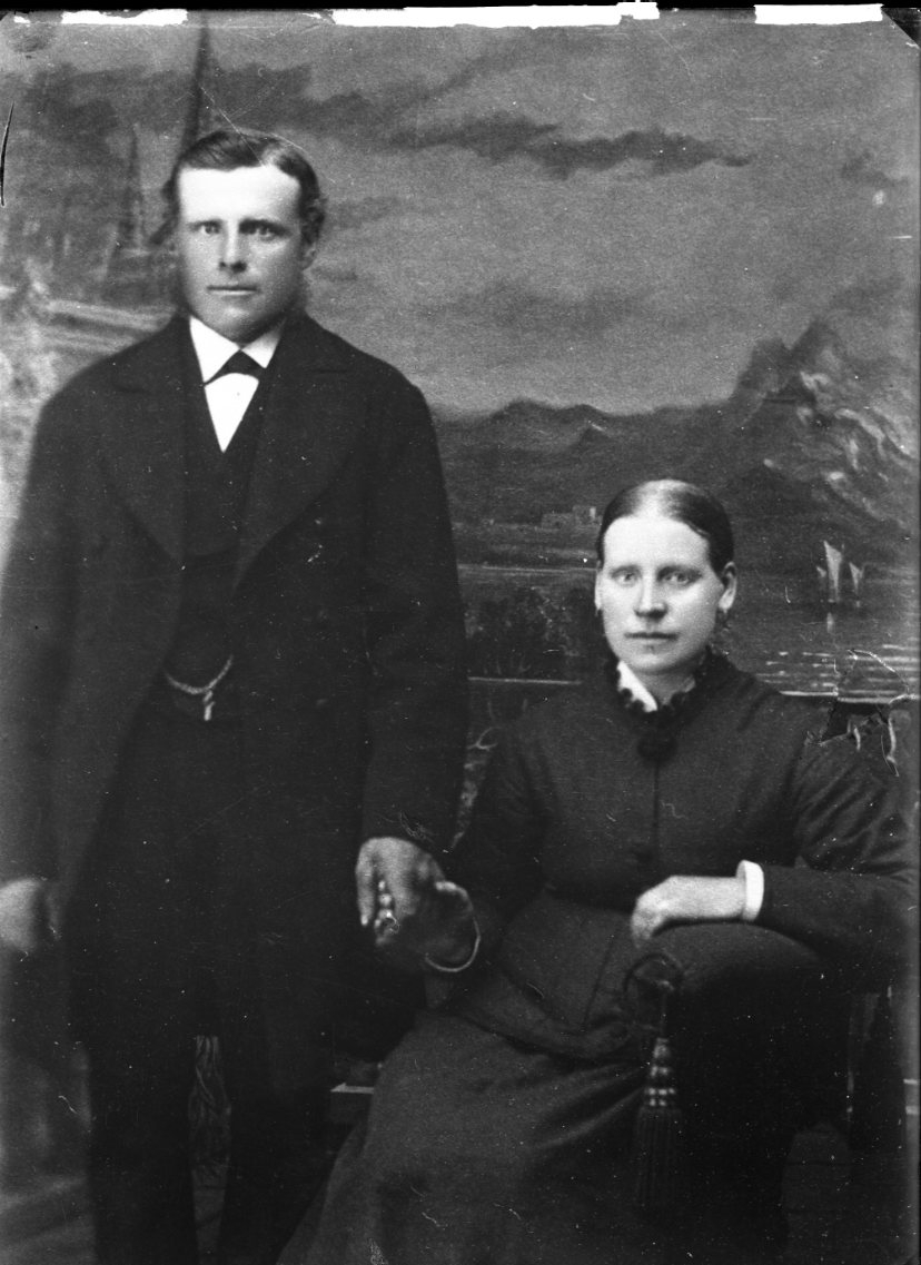 Porträtt av en okänd man och kvinna. Mannen står bredvid en sittande kvinna. De håller varandras hand. Sannolikt reprofotografi.