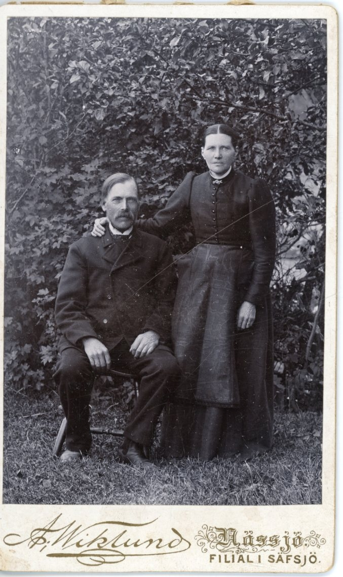 Porträtt av en okänd man och kvinna i en trädgård. Kvinnan står intill mannen som sitter på en stol.