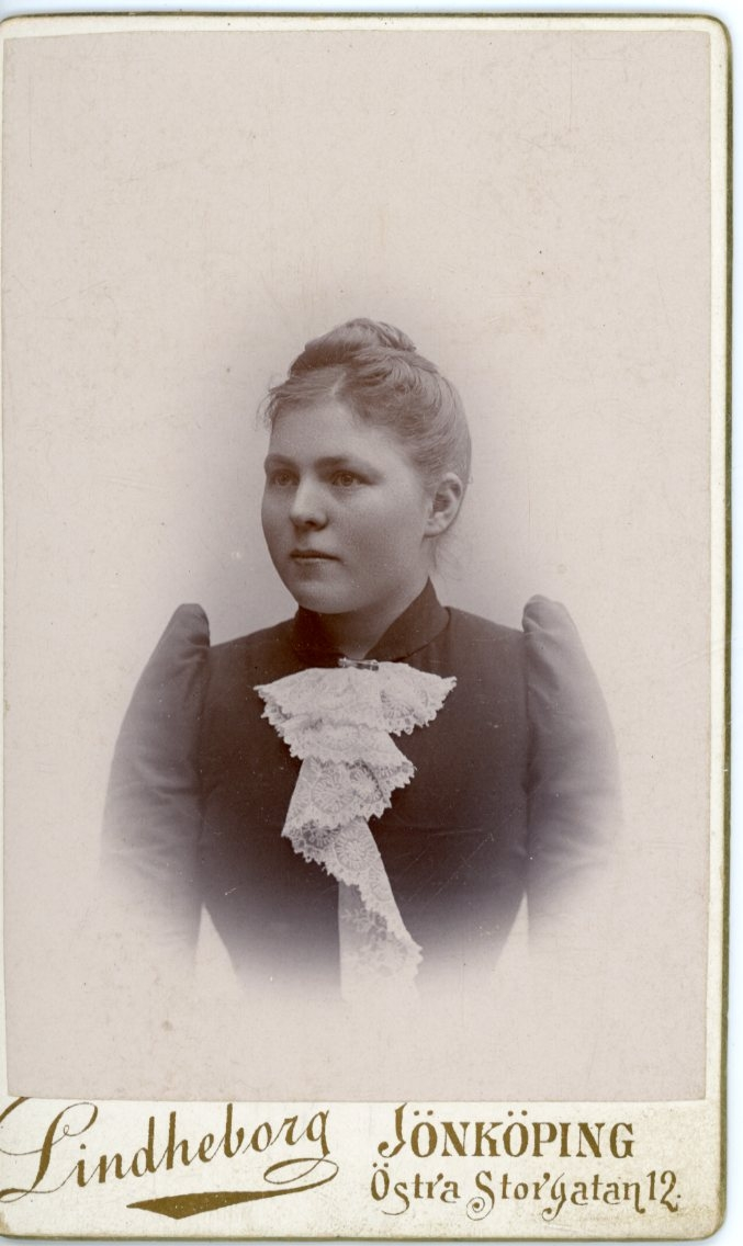 Porträtt av en okänd ung kvinna med vitt krås på bröstet, bröstbild.