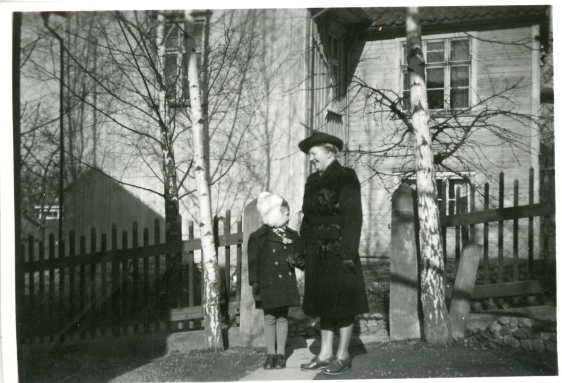 Porträtt av okänd kvinna med hatt och flicka som står vid grinden till ett tvåvåningshus med locklistpanel. En utbyggnad med liggande panel.
