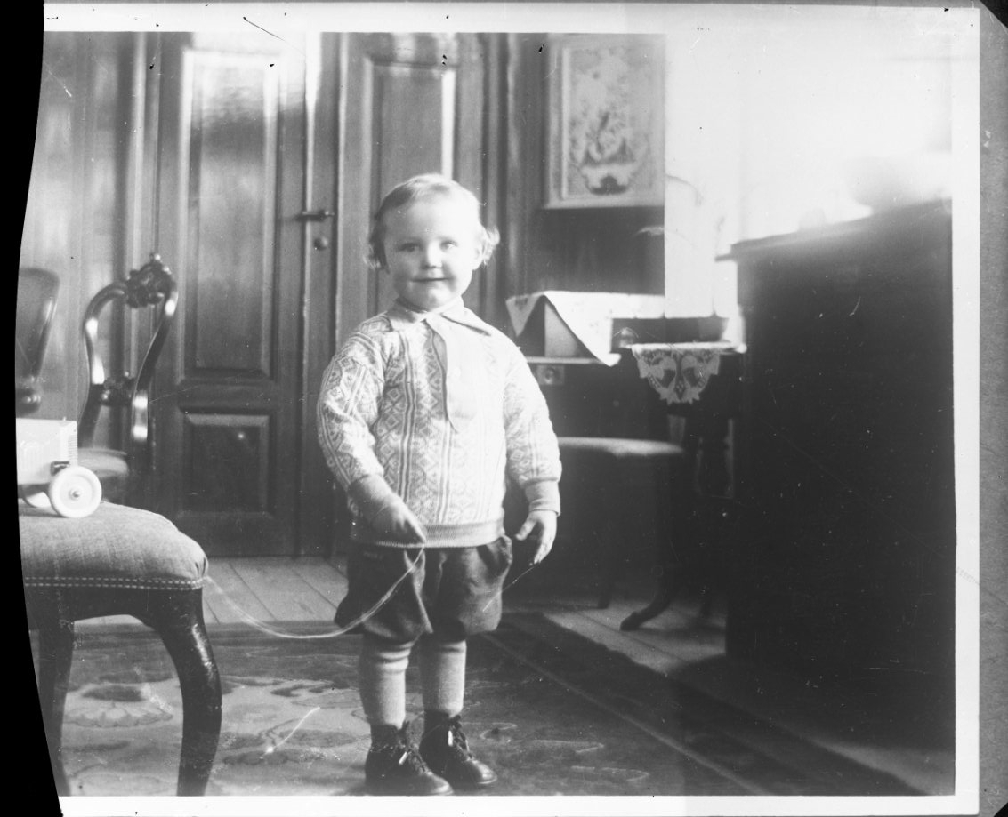 En liten pojke i hemmiljö. Han håller ett snöre till en leksakshund som står på en stol intill honom.
