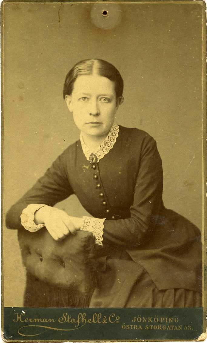 Porträtt av en ung kvinna i mörk klänning med virkad vit krage. Hon sitter lutad mot en stolsrygg.