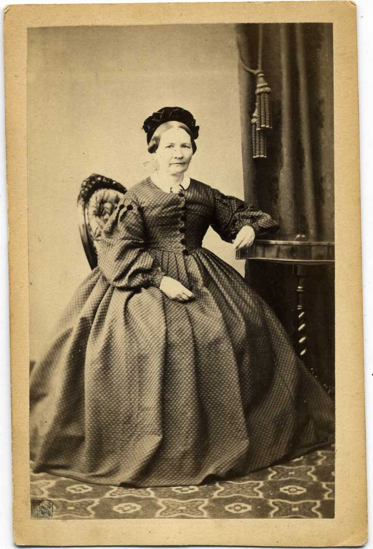 Porträtt av en kvinna i vid mönstrad klänning som sitter vid ett pelarbord.