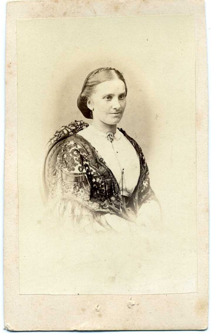 Porträtt av en kvinna som sitter på en stol, bröstbild.