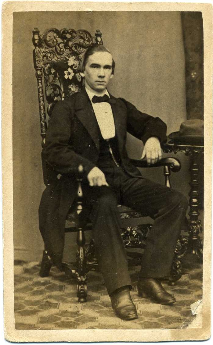 Porträtt av en ung man som sitter på en stol med hög snidad rygg vid ett pelarbord. Det ligger en hatt på bordet.