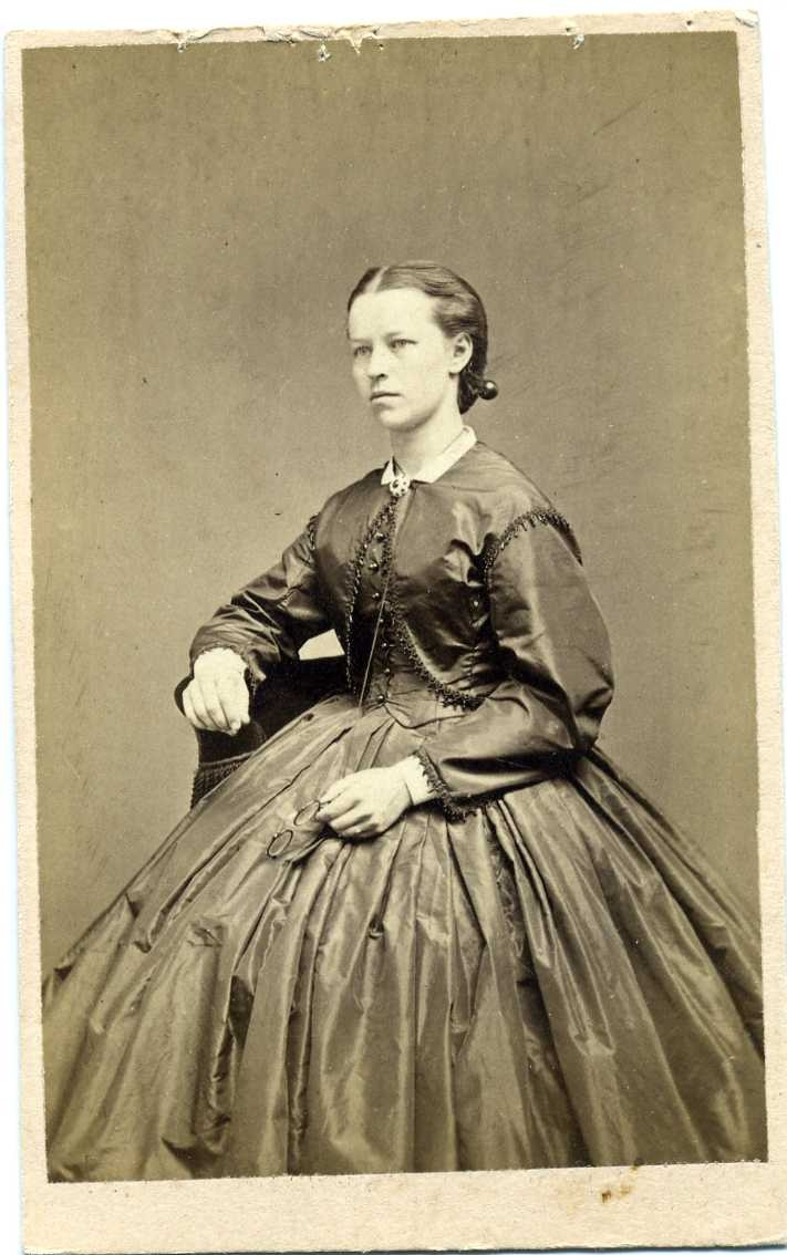 Porträtt av en ung kvinna i vid klänning som sitter på en stol. Hon håller ett par glasögon i vänster hand.