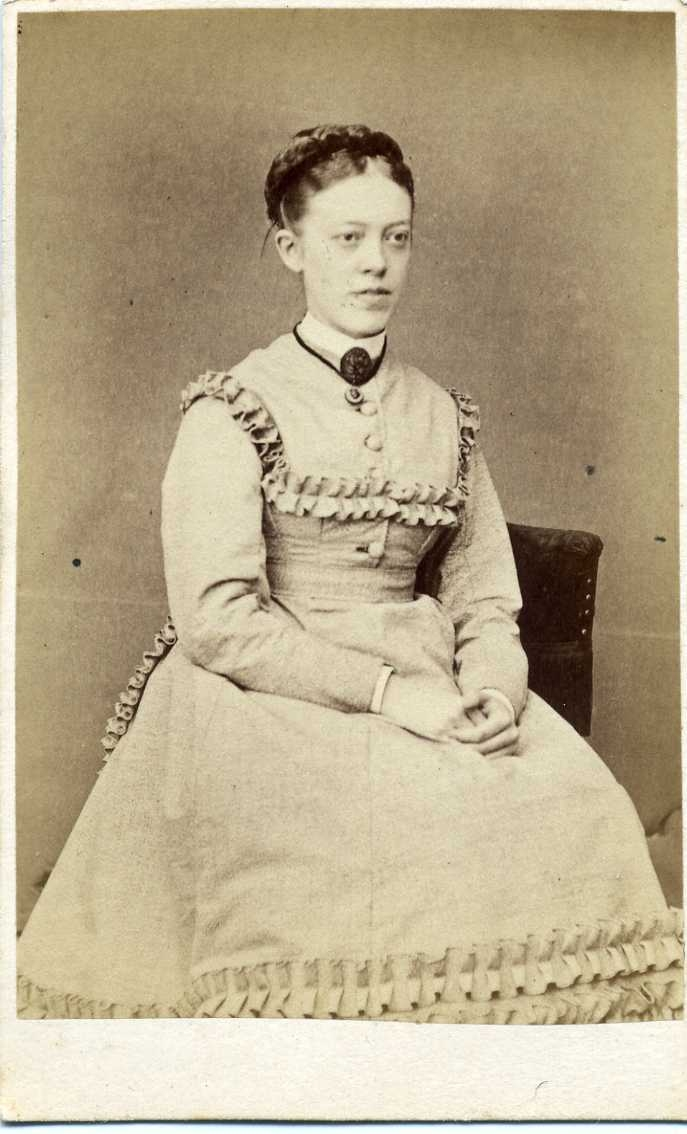 Porträtt av en ung okänd kvinna som sitter på en stol. Klänning med veckad bård