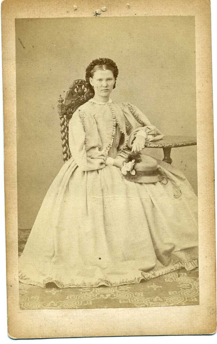 Porträtt av en ung kvinna som sitter på en stol med hög snidad rygg vid ett pelarbord. Klänning med veckad bård