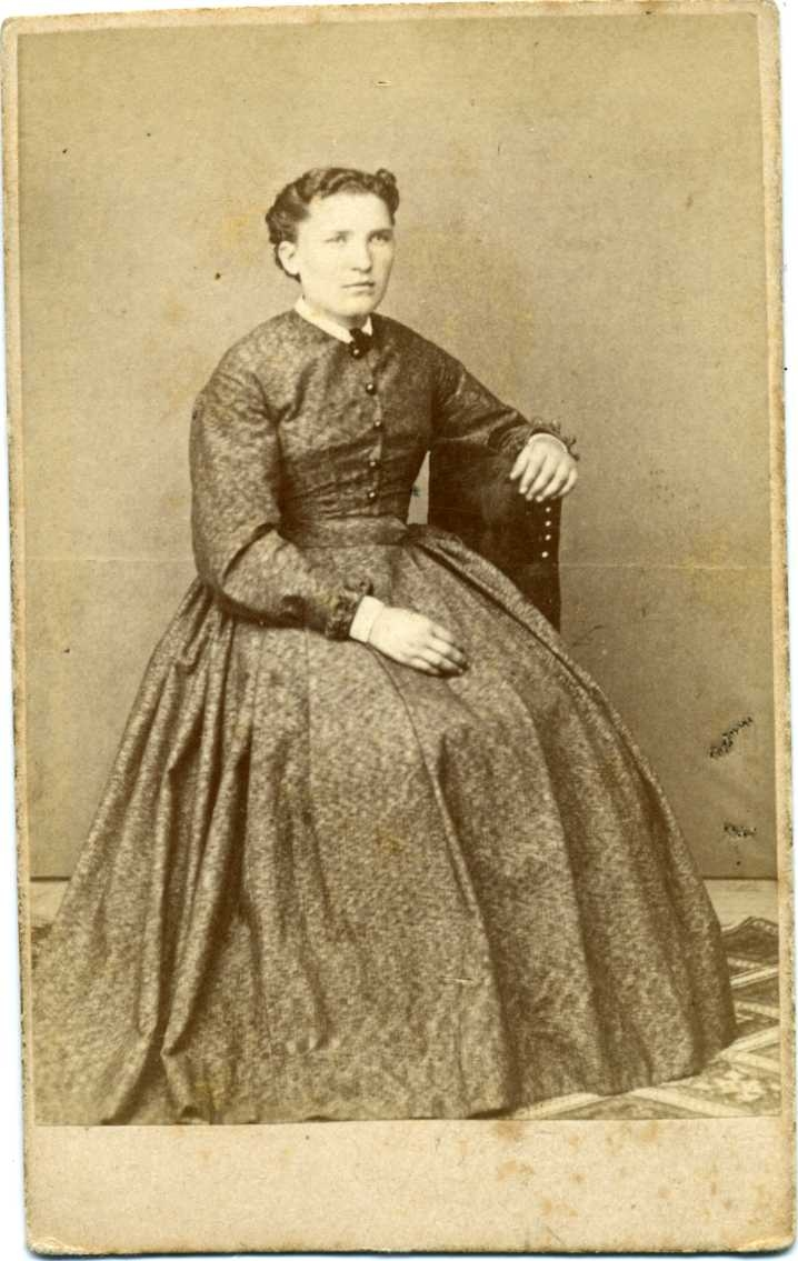 Porträtt av en kvinna i mönstrad klänning med mörka runda knappar vid bröstet. Hon sitter på snedden på en stol med nitar i kanten.