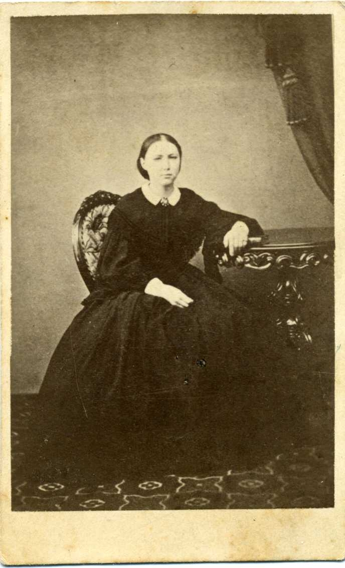 Porträtt av en kvinna som sitter på en stol vid ett pelarbord.