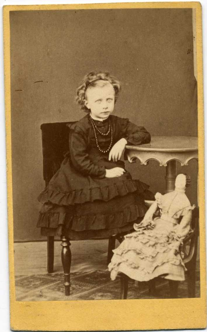 Porträtt av en liten flicka som sitter på en stol vid ett runt pelarbord. På en liten stol intill sitter det en docka.